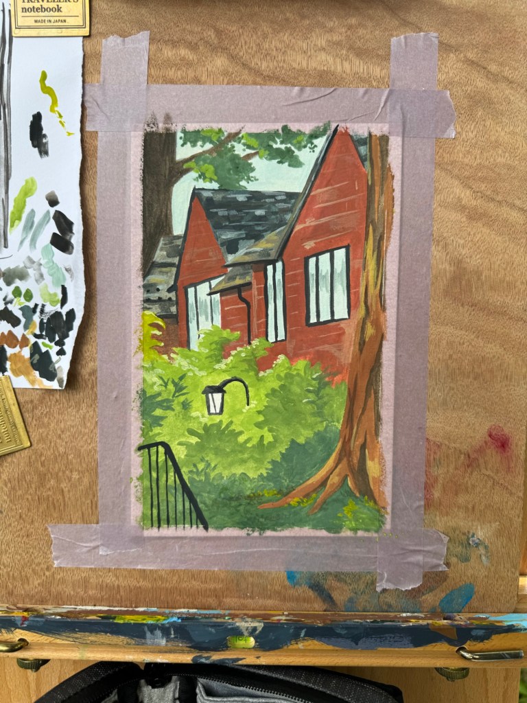 Two hours goes by extremely quickly when painting. I was a bit wimpy with my darks while color-mixing, and the resulting painting wasn’t quite as moody or cozy as I intended. Over-brightness is often an issue I have with mixing jelly gouache. I was happy with the relatively lighter kit that I brought with me though. Next time, I might swap out some of my current jelly gouache tubs for darker colors, and possibly pare down the color selection that I bring.