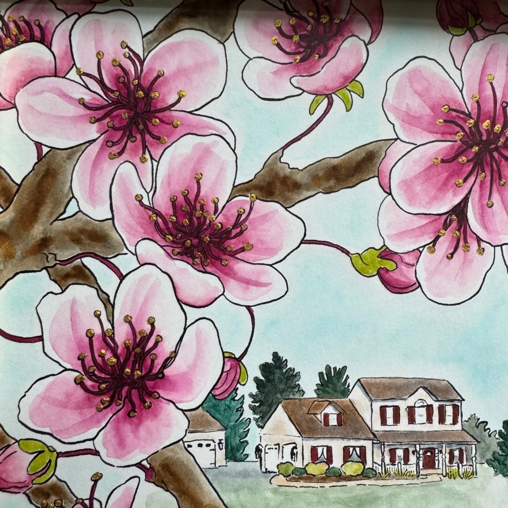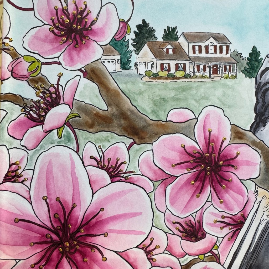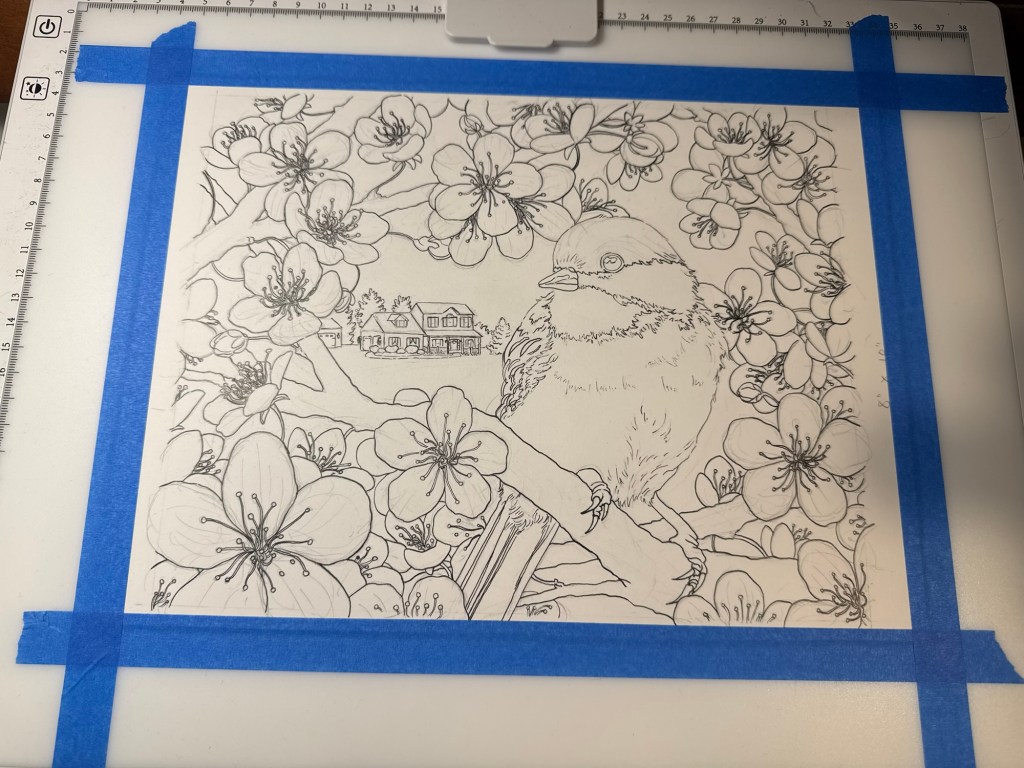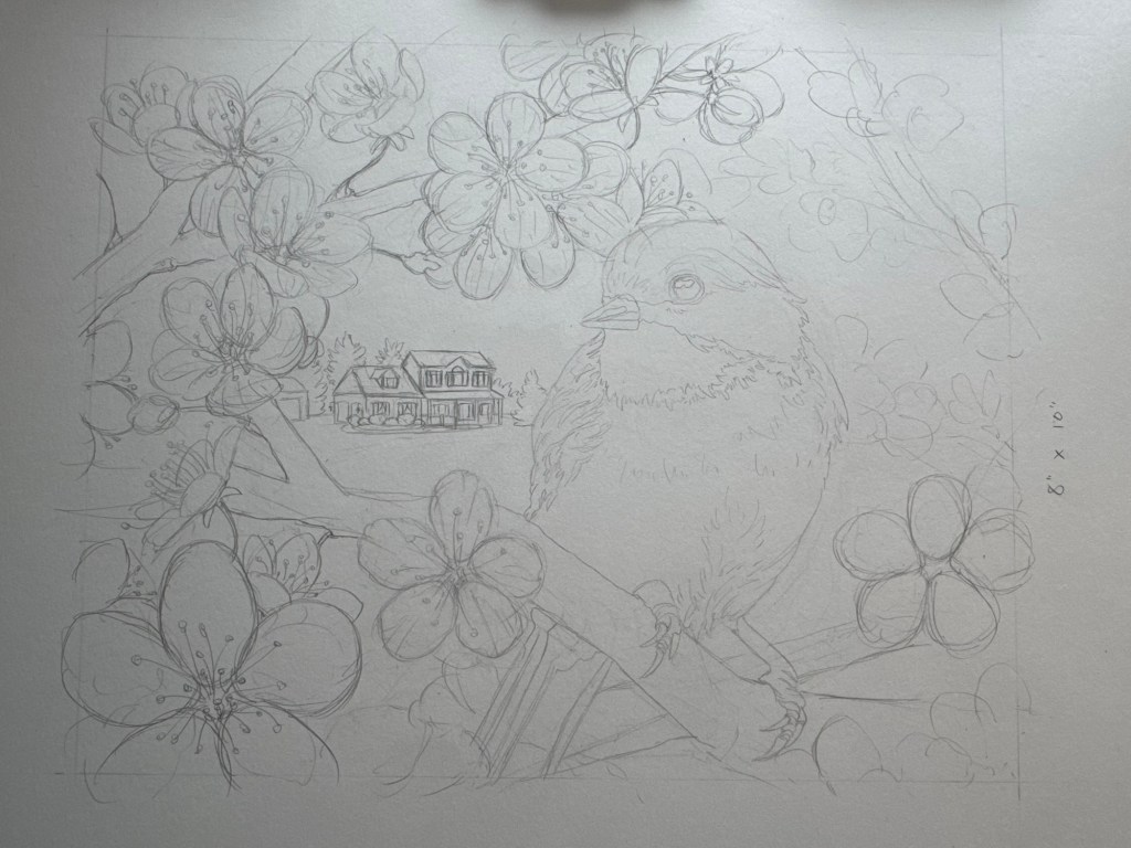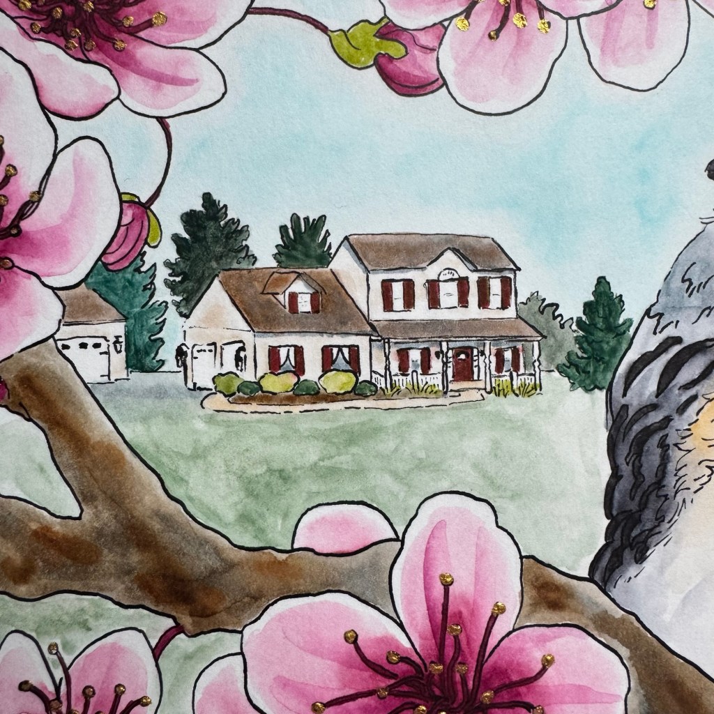 There were many, many iterations of composition before I landed on one that felt right. My fiancé helped break me out of a compositional rut when he suggested I incorporate a “secondary subject.” Brilliant! The in-laws’ house entered the scene and remedied my composition woes while adding a bonus memento factor to the piece.