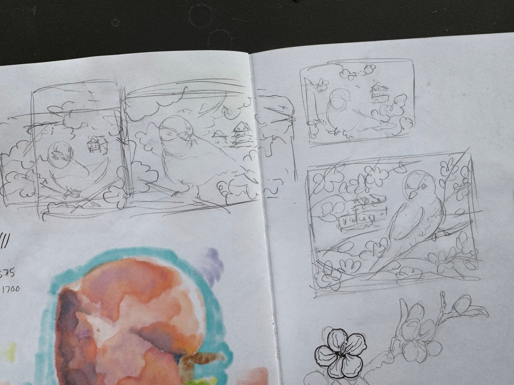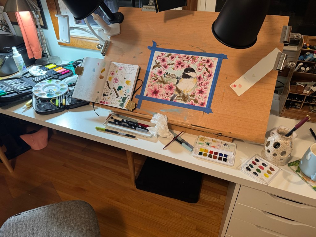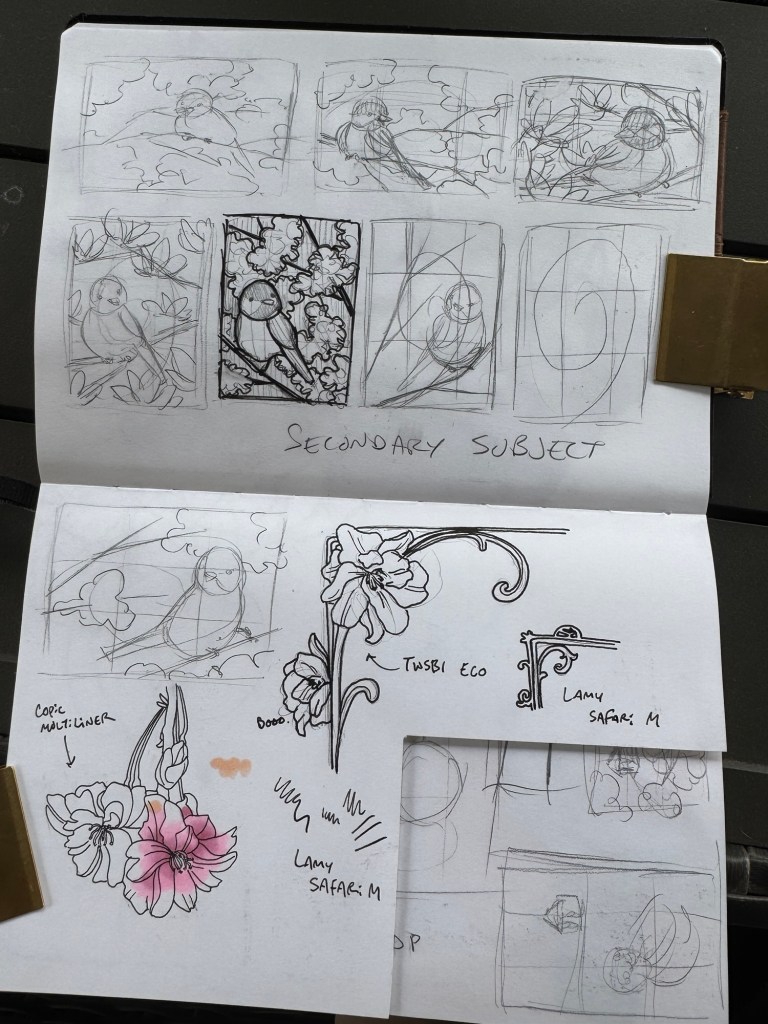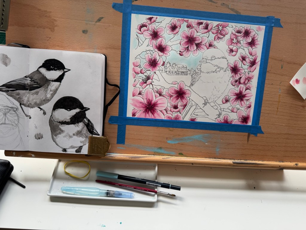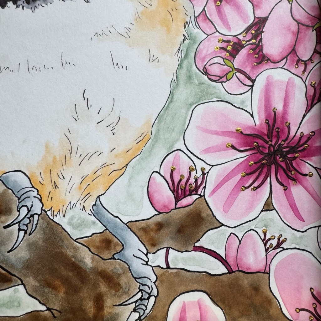 Somehow I realized further into preliminary sketches that it had been a very long time since I’d drawn cherry blossoms. There was a lot of trial-and-error as I tested line weights and illustrative styles with different inking tools. Eventually I gravitated toward the trusty dip pen with Manga G-pen nib; I return to this pen constantly with floral illustrations. It’s just so good! It deserves its fame.