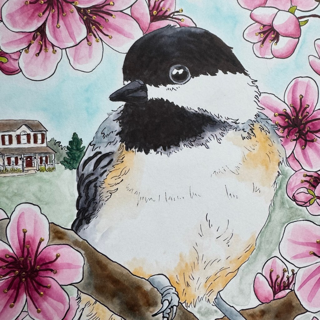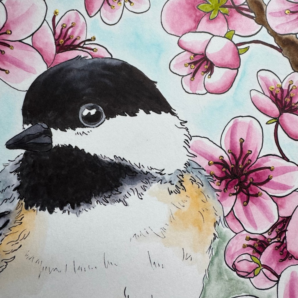 While I began with the plan to color this fully in Tombow water-based brush markers, the project gradually became mixed-media as I practiced more with the palette. I seemingly can never resist adding gold acrylic ink to a floral illustration.