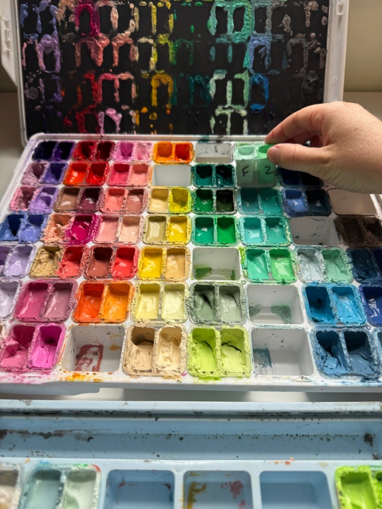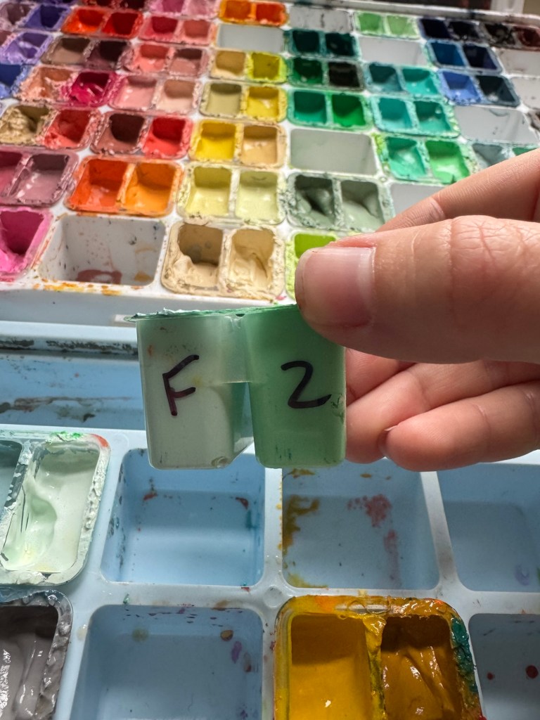 Naming the tubs like this is also helpful for making color swatch charts for yourself, and for picking out palettes for a project. You can easily identify the color you used by its grid placement.