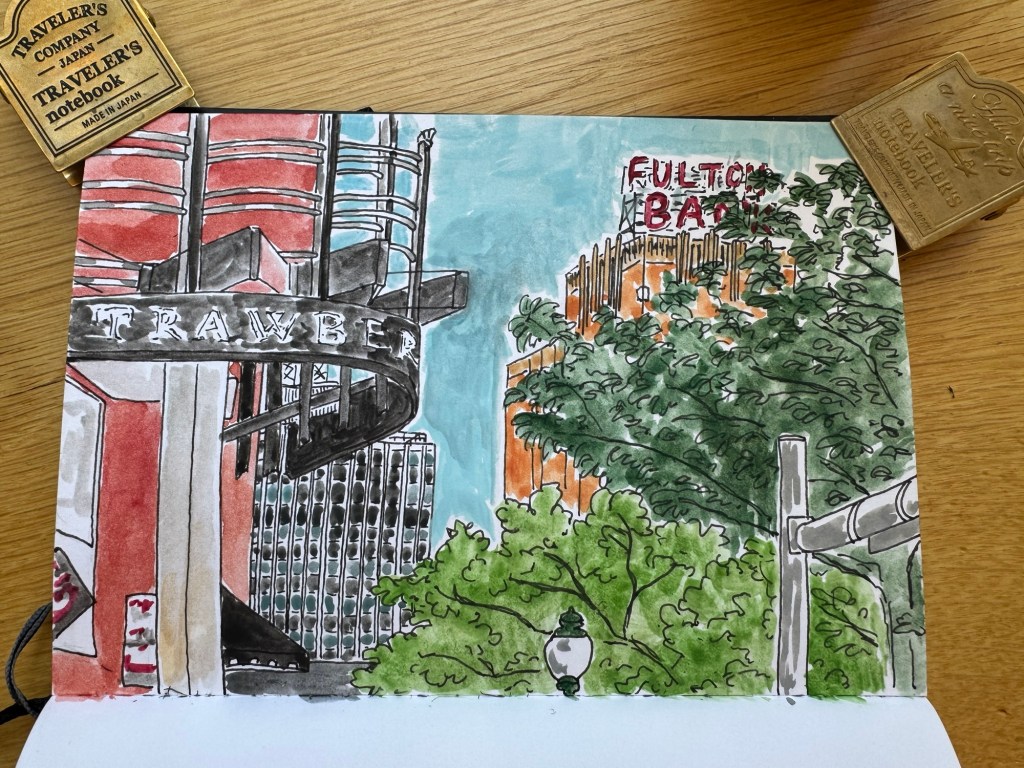 It’s amazing how time flies when sketching. This ink-and-watercolor sketch took up the full two hours that I spent with the city’s urban sketching group.